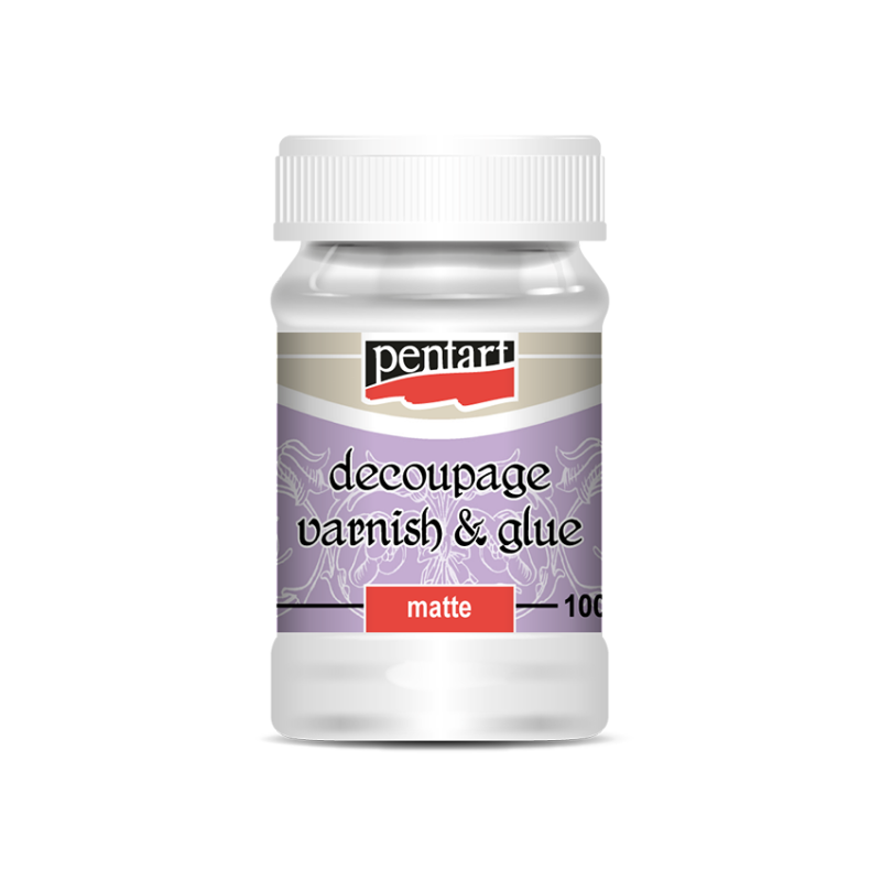 Декупажно лепило и лак в едно - за декупаж с матов завършек. Използвайте за залеяне на декупажна,оризова хартия и салфетки. Нанася се с четка, за предпочитане мека със синтетичен косъм. Изключително добър продукт с по-рядка консистенция, която му позволява добро разнасяне и икономичност при декупаж върху големи площи.