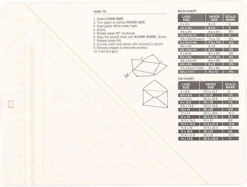Комплекта включва дъска за биговане със слака в инчове и сантиметри , уред за биговане, перфоратор за заобляне и инструкции