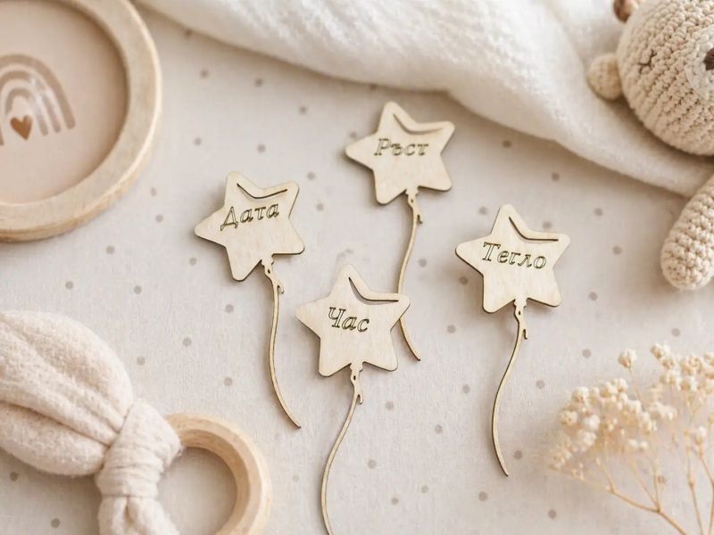 Елементи от бирен картон за Бебешка визитка Балончета Звезди – перфектният начин да отбележите важните детайли от раждането на вашето мъниче!