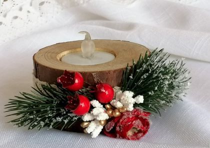 Свещник от натурално дърво с височина 4,00 см, диаметър около 8 см ( поради естеството на продукта диаметърът варира от 6,50 до 8,50 см ) и място за свещ с диаметър 4,00 см.