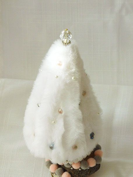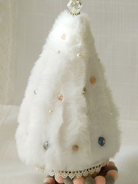 Ръчно изработена декорация Елхичка с пух, декоративни перлички, камъчета и дантела в бяло, розово и сиво.