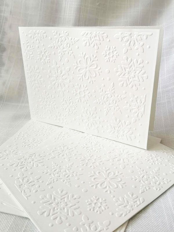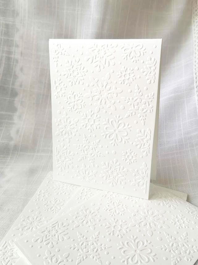 Комплекта включва 4 броя заготовки за картички (двойно прегънати ) от бял картон с релеф Снежинки .