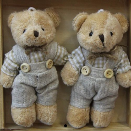 Мини плюшено мече с кафва риза и ленен гащеризон за различни декорации на рамки, кутии или за подарък