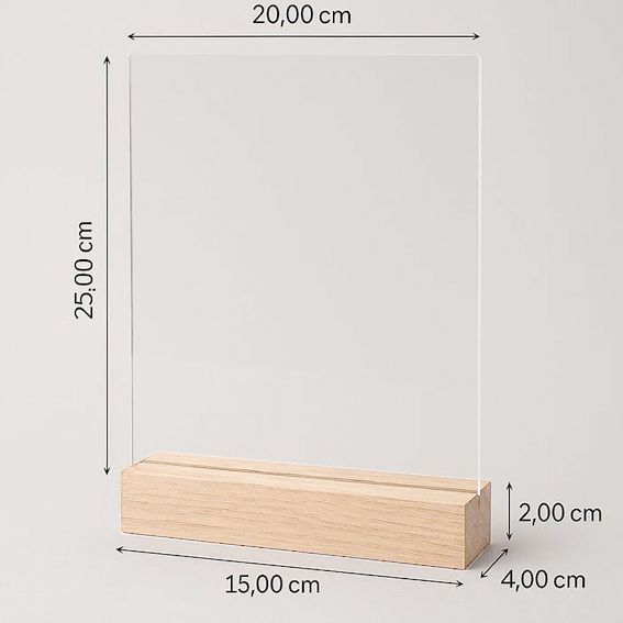 Кристално прозрачна плака за декорации, напдписи, табелки с поставка от необработена дървесина. Можете да я поставите вертикално или хоризонтално според целта и идета ви.