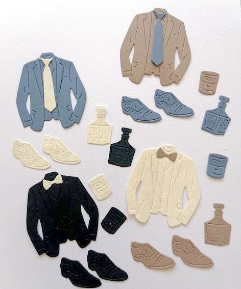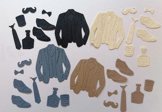Комплект елементи за мъже включва 8 елементи (сако, чифт обувки, вратовръзка, папионка, мустаци чаша и бутилка) от 4 цвята картон, по един елементи от всеки цвят.