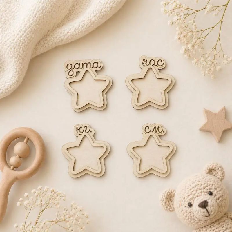 Елементи от бирен картон за Бебешка визитка Звездички - Дата, Час, Килограми, Сантиметри - 4 елемента