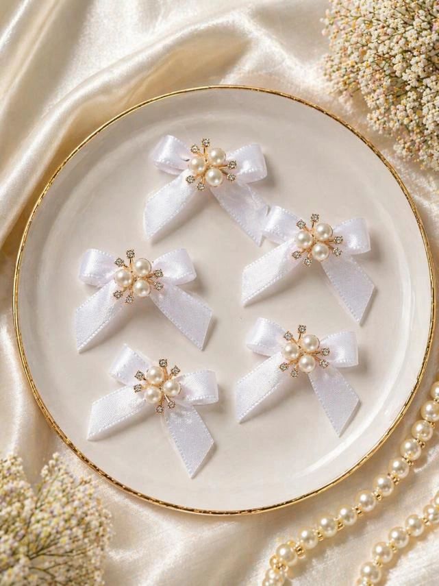 Луксозни Сатенени Мини Панделки в Бяло с Перли и Камъчета – Комплект от 5 бр.